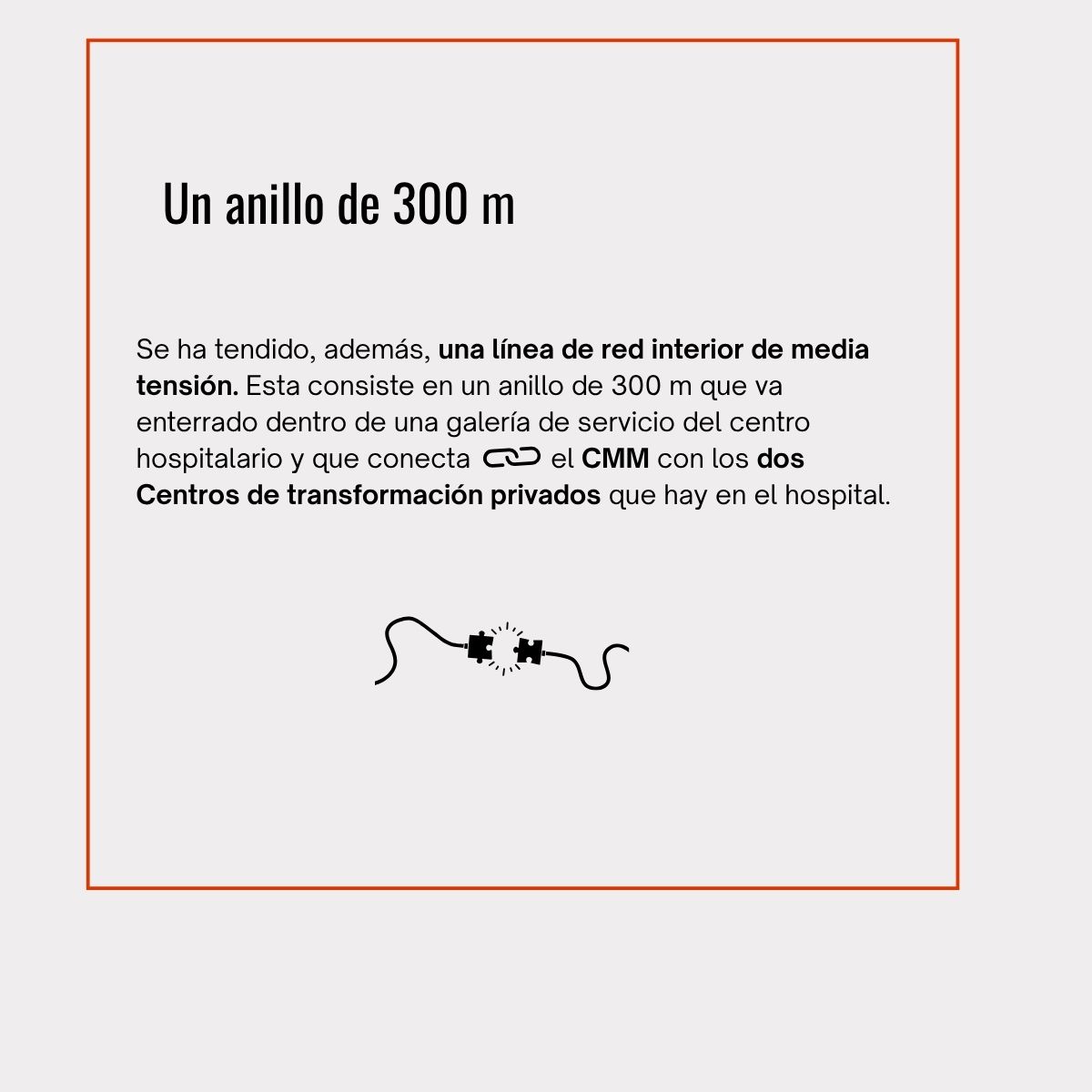 Se ha tendido, además, una línea de red interior de media tensión que consiste en un anillo de 300 m que va enterrado dentro de una galería de servicio del centro hospitalario y que conecta el CMM con los dos Centros de transformación privados que hay en el hospital.